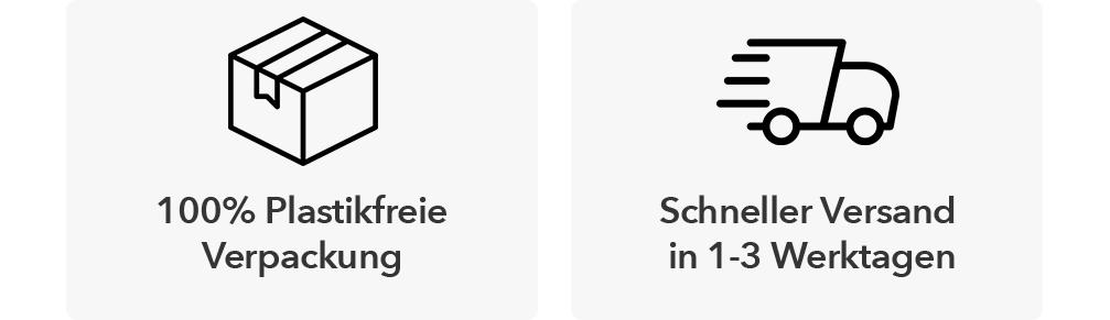 Unsere Produkte und Verpackungen sind zu 100% plastikfrei – vom Herstellungsprozess bis zur Lieferung zu dir nach Hause.